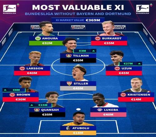 北京时间10月14日,在更新了德甲球员的身价之后,德转列出了德甲目前最贵的11人阵容,身价1.4亿欧元的穆西亚拉和身价1.3亿欧元的奥利塞领衔。此外,德转也列出了不含拜仁慕尼黑和多特蒙德球员的德甲最贵阵容。