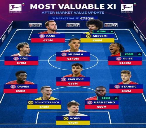 亚历山大-帕夫洛维奇(拜仁慕尼黑)5500万欧元、奥利塞(拜仁慕尼黑)1.3亿欧元、穆西亚拉(拜仁慕尼黑)1.4亿欧元、路易斯-迪亚斯(拜仁慕尼黑)7000万欧元