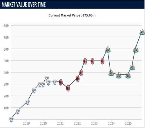 现效力纽卡的托纳利身价上涨1500万至7500万欧,成为意大利身价第二高的球员,仅次于8000万欧的巴斯托尼。