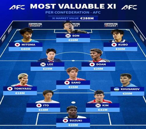 北京时间10月16日,德转列出了目前亚洲球员中身价最高的11人阵容,身价4000万欧元的三笘薰领衔,身价3500万欧元的胡桑诺夫、身价3200万欧元的金玟哉以及身价3000万欧元的久保建英