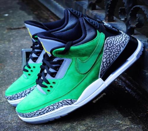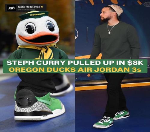 据美国球鞋媒体soleretriever报道,库里在昨日入场时上脚了超级罕见的AJ3俄勒冈大学配色,而这双鞋是AJ为俄勒冈大学设计的专属款(NIKE总部位于俄勒冈州),仅为俄勒冈大学篮球队提供,发布后并没有进行市售。