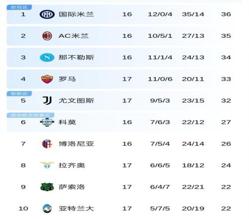 而卫冕冠军那不勒斯34分屈居第3位,罗马和尤文分别积33分和32分,排名第4和第5位,尤文则领先身后的第6名科莫队多达5分。