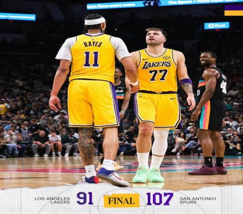 雷迪克请求暂停,选择提前认输。两队尽遣替补,比赛就此失去了悬念。湖人连续远投不进,比赛时间走完。最终,马刺以107比91完胜对手,就此止住了2连败。圣安东尼奥巩固了西部第2的排位,湖人的3连胜则被终结。数据显示:这是紫金军团本赛季第12场失利。据ESPN统计,湖人赛季开局的12负每场输球分差都在两位数,创NBA历史开季最长纪录。此战之后,湖人排名跌至西部第5,暂时被掘金、火箭反超。